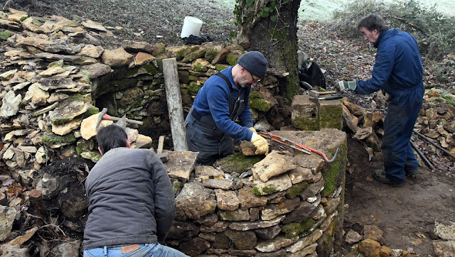 - La restauration de la cabane des Bayles s’est poursuivie, le jambage gauche de la porte constitué de deux grosses pierres a été redressé et le mur gauche démoli et reconstruit.